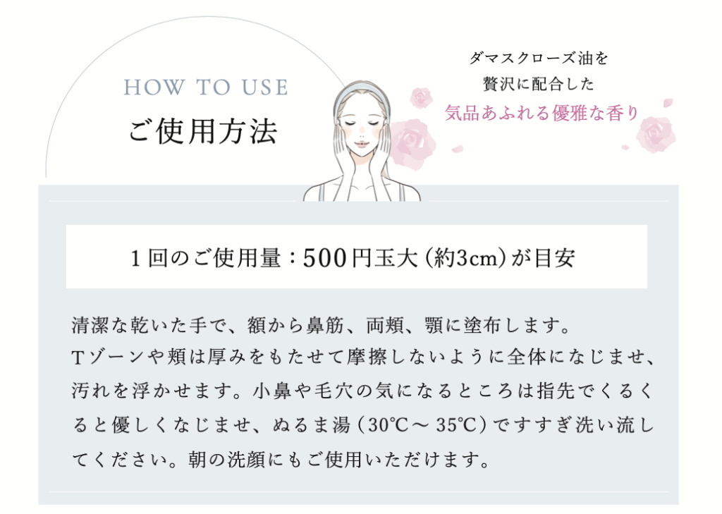 ソフトなピーリング効果で角栓が 毛穴に溜まるのを防ぎ、 鼻の黒ずみや白ニキビに効果があ ります。